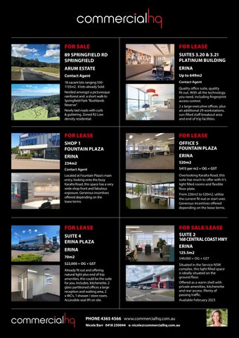 FOR LEASE OFFICE 5 FOUNTAIN PLAZA ERINA 520m2 $415 per m2 + OG + GST Overlooking Karalta Road, this suite has much to o er with it’s light lled rooms and exible oor plate. From 226m2 to 520m2, utilize the current t-out or start over. Generous incentives o ered depending on the lease terms. FOR LEASE SHOP 1 FOUNTAIN PLAZA ERINA 234m2 Contact Agent Located at Fountain Plaza’s main entry, looking onto the busy Karalta Road, this space has a very wide shop front and fabulous exposure. Generous incentives o ered depending on the lease terms. FOR LEASE SUITE 4 ERINA PLAZA ERINA 70m2 $22,000 + OG + GST Already t out and o ering natural light plus end of trip amenities, this could be the suite for you. Includes, kitchenette, 2 glass partitioned o ces a large reception and waiting area, 2 x WC’s, 1 shower / store room, Accessible seat lift on site. PHONE 4365 4566 www.commercialhq.com.au Nicole Barr 0418 230044 e: nicole@commercialhq.com.au FOR LEASE SUITES 3.20 & 3.21 PLATINUM BUILDING ERINA Up to 649m2 Contact Agent Quality o ce suite, quality t-out. With all the technology you need, including ngerprint access control. 2 x large executive o ces, plus an additional 29 workstations, sun- lled sta breakout area and end of trip facilities. FOR SALE/LEASE SUITE 2 168 CENTRAL COAST HWY ERINA 125.5m2 $49,000 + OG + GST Situated in the Service NSW complex, this light lled space is ideally situated on the ground oor. O ered as a warm shell with private amenities, kitchenette and rear access. Plenty of passing tra c. Available February 2023 FOR SALE 89 SPRINGFIELD RD SPRINGFIELD ARUM ESTATE Contact Agent 18 vacant lots ranging 5501135m2. 8 lots already Sold. Nestled amongst a picturesque rainforest and a short walk to Spring eld Park “Bushlands Reserve”. Newly laid roads with curb & guttering. Zoned R2 Low density residential.