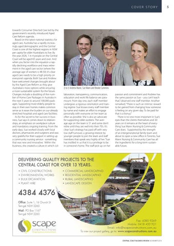 4384 4376 Office: Suite 1, 16 Church St Terrigal NSW 2260 Mail: PO Box 1167 Terrigal NSW 2260 Fax: 4385 9269 Mobile: 0418 433 921 Email: info@scapeconstructions.com.au To view our project gallery, go to: www.scapeconstructions.com.au CENTRAL COAST BUSINESS REVIEW NOVEMBER 2014