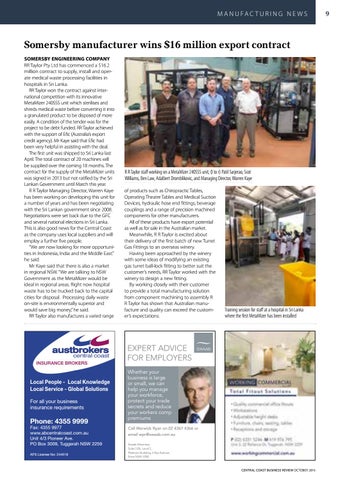 Somersby manufacturer wins $16 million export contract SOMERSBY ENGINEERING COMPANY RR Taylor Pty Ltd has commenced a $16.2 million contract to supply, install and operate medical waste processing facilities in hospitals in Sri Lanka. RR Taylor won the contract against international competition with its innovative MetaMizer 240SSS unit which sterilises and shreds medical waste before converting it into a granulated product to be disposed of more easily. A condition of the tender was for the project to be debt funded. RR Taylor achieved with the support of Efic (Australia’s export credit agency). Mr Kaye said that Efic had been very helpful in assisting with the deal. The first unit was shipped to Sri Lanka last April. The total contract of 20 machines will be supplied over the coming 18 months. The contract for the supply of the MetaMizer units was signed in 2013 but not ratified by the Sri Lankan Government until March this year. R R Taylor Managing Director, Warren Kaye has been working on developing this unit for a number of years and has been negotiating with the Sri Lankan government since 2008. Negotiations were set back due to the GFC and several national elections in Sri Lanka. This is also good news for the Central Coast as the company uses local suppliers and will employ a further five people. “We are now looking for more opportunities in Indonesia, India and the Middle East.� he said. Mr Kaye said that there is also a market in regional NSW. “We are talking to NSW Government as the MetaMizer would be ideal in regional areas. Right now hospital waste has to be trucked back to the capital cities for disposal. Processing daily waste on-site is environmentally superior and would save big money,� he said. RR Taylor also manufactures a varied range