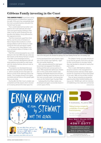 Gibbens Family investing in the Coast The Gibbens Family moved their spring making business to Gosford from Sydney in the early 1970s and it has undoubtedly been the most successful business relocation the Central Coast has seen. This is a bold statement but when compared to the multi-nationals who have come and gone leaving nothing in their wake it may be worth analysing the real benefits that Gibbens Group delivered to the regional economy. Their first investment, apart from their homes, was five acres (2 hectares) on Manns Road at West Gosford on which George Gibbens built his factory to make springs for the local and export market. In the years since, Greg Gibbens’ sons have reinvested millions of dollars in the Central Coast. Their first commercial property was a Joint Venture in the mid-1980s that saw what was then known as the Harvey Norman Complex (now Palm Court) developed at Erina. It was a visionary development with offstreet parking surrounded by retail shops with the Harvey Norman discount store as its centrepiece. This property was developed because the Joint Venture partners had identified a need to provide services that were created as a result of the opening of Erina Fair nearby. This complex proved to be highly successful and set Erina on the growth path that we see today. Shortly after the Palm Court complex was completed and fully leased, which showed an increasing demand for retail space the