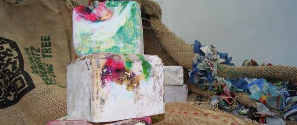 Her work takes from multiple disciplines including 3D sculpture which she used in her end of year show by creating large compositions made from recycled hessian sacks and other recycled materials that she printed on and draped over tables and chairs. Her theme was to explore colonialism and the coffee industry.