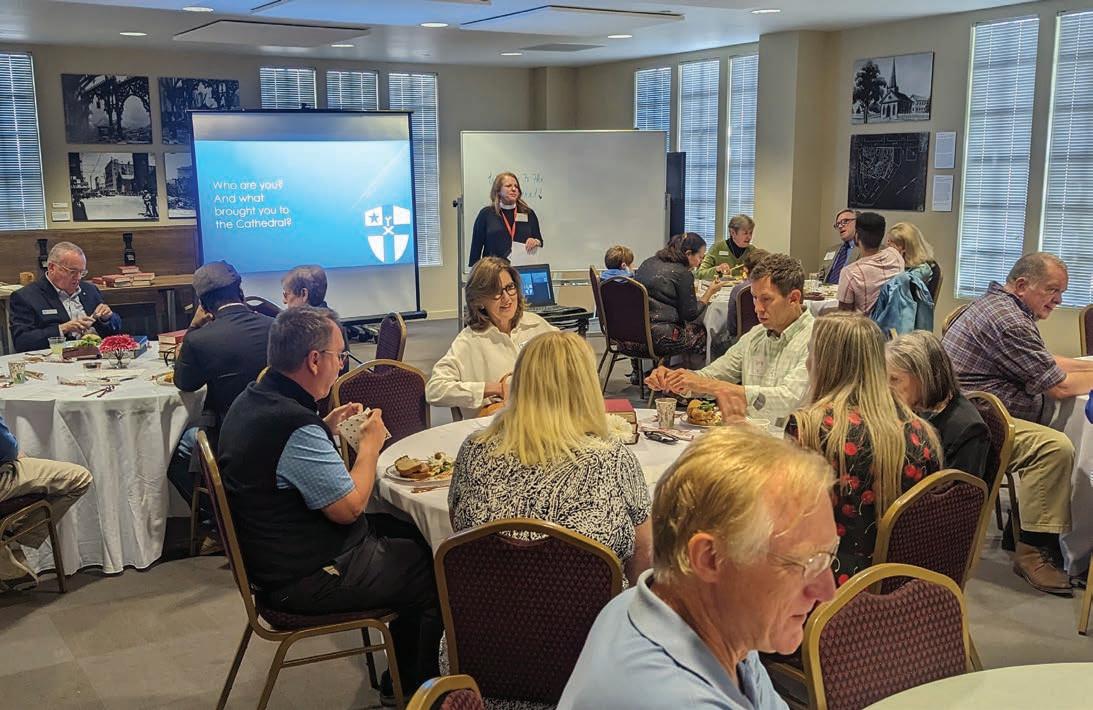 Above: Cathedral kids experience the Jesus’ walk at stations offering hands-on during The Five Senses of Holy Week. Kathy Pfister offers an overview of life at during the Newcomer Lunch and Learn.