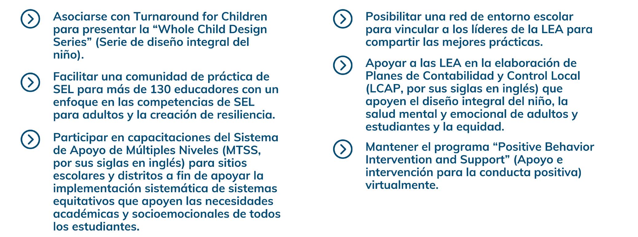 Nos asociamos con el equipo de salud conductual del condado de Contra Costa para iniciar el “Wellness in Schools Program” (Programa de Bienestar en las Escuelas) (WISP, por sus siglas en inglés), un programa a nivel del condado, y contratamos a CARE Solace, un servicio de coordinación de atención de salud mental gratuito y confidencial disponible para todo el personal, los estudiantes y las familias de la CCCOE y seis distritos escolares del condado.