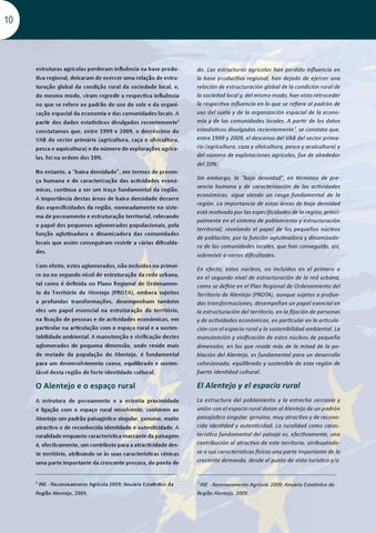 do. Las estructuras agrícolas han perdido influencia en la base productiva regional, han dejado de ejercer una relación de estructuración global de la condición rural de la sociedad local y, del mismo modo, han visto retroceder la respectiva influencia en lo que se refiere al padrón de uso del suelo y de la organización espacial de la economía y de las comunidades locales. A partir de los datos estadísticos divulgados recientemente¹, se constata que, entre 1999 y 2009, el descenso del VAB del sector primario (agricultura, caza y silvicultura, pesca y acuicultura) y del número de explotaciones agrícolas, fue de alrededor del 10%. Sin embargo, la “baja densidad”, en términos de presencia humana y de caracterización de las actividades económicas, sigue siendo un rasgo fundamental de la región. La importancia de estas áreas de baja densidad está motivada por las especificidades de la región, principalmente en el sistema de poblamiento y estructuración territorial, revelando el papel de los pequeños núcleos de población, por la función aglutinadora y dinamizadora de las comunidades locales, que han conseguido, así, sobrevivir a varias dificultades.