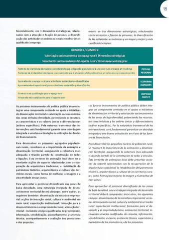 Para aproveitar o potencial diversificado das zonas de baixa densidade, uma estratégia integrada de desenvolvimento territorial deverá abranger, entre outros, os seguintes domínios: dinamização da iniciativa empresarial; acções de inovação social, cultural e ambiental em meio rural; capacitação institucional; formação para o desenvolvimento e o empreendedorismo; animação territorial – incluindo serviços qualificados de proximidade, informação, sensibilização, aconselhamento, assistência técnica, acompanhamento e avaliação dos promotores e dos projectos.