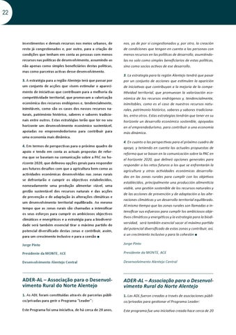 nos, ya de por sí congestionados y, por otro, la creación de condiciones que tengan en cuenta a las personas con menos recursos en las políticas de desarrollo, asumiéndolas no solo como simples beneficiarios de estas políticas, sino como socios activos de ese desarrollo. 3. La estrategia para la región Alentejo tendrá que pasar por un conjunto de acciones que estimulen la aparición de iniciativas que contribuyan a la mejoría de la competitividad territorial, que promuevan la valorización económica de los recursos endrógenos y, tendencialmente, inimitables, como es el caso de nuestros recursos naturales, patrimonio histórico, saberes y sabores tradicionales, entre otros. Estas estrategias tendrán que tener en su horizonte un desarrollo económico sostenible, apoyadas en el emprendedurismo, para contribuir a una economía más dinámica. 4. En cuanto a las perspectivas para el próximo cuadro de apoyo, y teniendo en cuenta las actuales propuestas de reforma que se basan en la comunicación sobre la PAC en el horizonte 2020, que delineó opciones generales para responder a los retos futuros a los que se enfrentarán la agricultura y otras actividades económicas desarrolladas en las zonas rurales para cumplir con los objetivos establecidos, principalmente una producción alimenticia viable, una gestión sostenible de los recursos naturales y de las acciones de prevención y de adaptación a las alteraciones climáticas y un desarrollo territorial equilibrado. Al mismo tiempo que las zonas rurales son llamadas a intensificar sus esfuerzos para cumplir los ambiciosos objetivos climáticos y energéticos y la estrategia para la biodiversidad, será también esencial sacar el máximo partido del potencial diversificado de estas zonas y contribuir, así, a un crecimiento inclusivo y para la cohesión ■