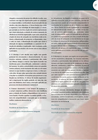 to. Actualmente, ha llegado el momento de pasar de la reflexión a la acción, pues, en caso contrario, este tipo de organizaciones puede ver seriamente comprometida la continuidad de la consecución de su misión y sus objetivos. Terras Dentro ha venido organizando su estrategia de intervención en dos niveles: por un lado, en la creación de sectores operacionales, que pretenden, sobre todo, la reducción de costes y el aumento de la eficiencia en cuanto a la organización; por otro, a través de la creación de áreas de actuación en los territorios en los que se incluyen la dinamización de proyectos cofinanciados, así como, cada vez más, la dinamización de acciones que busquen obtener alguna rentabilidad y el aumento de la obtención de apoyos a la explotación, cuyos resultados serán aplicados en su misión y de acuerdo con sus valores y principios. 3. El Alentejo es, sin duda, una región con un gran potencial de crecimiento y desarrollo. Sus recursos naturales, culturales y patrimoniales han señalado en los últimos tiempos una ligera inversión en las tendencias de desertificación, ambiental y, sobre todo, humana. Si antes el atractivo estaba en los grandes centros urbanos, en este momento son cada vez más quienes tienden a regresar a sus tierras de origen para sacar provecho de ellas. Hay que saber aprovechar esta voluntad latente y ofrecer las condiciones necesarias para promover su fijación en los territorios. El refuerzo del tejido organizativo y empresarial de la región podrán ser una de las vías para esta dinámica, así como la innovación aplicada a los procesos de desarrollo sostenible. 4. Estamos viviendo, claramente, tiempos de cambios y la actual coyuntura política demuestra una tendencia hacia la reducción de fondos disponibles y en el acceso a esos fondos. Saldrán beneficiados, en mi opinión, los factores de competitividad e innovación que mejor sepan demostrar los territorios ■ Elsa Branco Presidente da Terras Dentro Associação para o Desenvolvimento Integrado