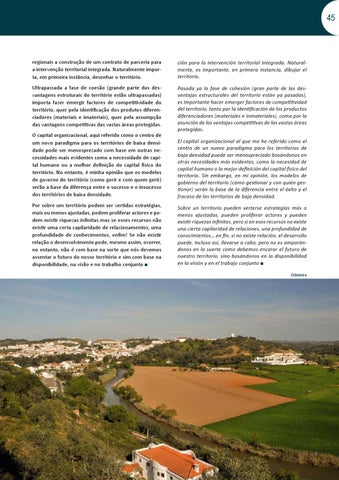El capital organizacional al que me he referido como el centro de un nuevo paradigma para los territorios de baja densidad puede ser menospreciado basándonos en otras necesidades más evidentes, como la necesidad de capital humano o la mejor definición del capital físico del territorio. Sin embargo, en mi opinión, los modelos de gobierno del territorio (cómo gestionar y con quién gestionar) serán la base de la diferencia entre el éxito y el fracaso de los territorios de baja densidad. Sobre un territorio pueden verterse estrategias más o menos ajustadas, pueden proliferar actores y pueden existir riquezas infinitas, pero si en esos recursos no existe una cierta capilaridad de relaciones, una profundidad de conocimientos… en fin, si no existe relación, el desarrollo puede, incluso así, llevarse a cabo, pero no es amparándonos en la suerte como debemos encarar el futuro de nuestro territorio, sino basándonos en la disponibilidad en la visión y en el trabajo conjunto ■ Odemira