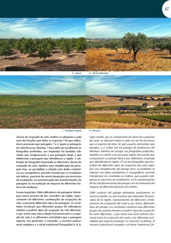 sajes rurales, por su composición de clases de ocupación de suelo, se adecúan mejor a cada una de las funciones que se esperan de ellos; b) qué usuarios demandan qué paisajes; y c) cuáles son los paisajes de preferencia del Alentejo. Además de escoger sus fotografías preferidas, también se solicitó a las personas objeto del estudio que compusiesen su paisaje ideal y que definiesen el paisaje que identificaba la región. El uso de fotografías que ilustraban los diferentes tipos de ocupación del suelo significa una simplificación del paisaje pero, al posibilitar la relación con datos estadísticos o cartográficos, permite transformar los resultados en índices, que pueden integrarse en ejercicios de modelación, en la monitorización de las transformaciones del paisaje o en la evaluación del impacto de diferentes factores de cambio.