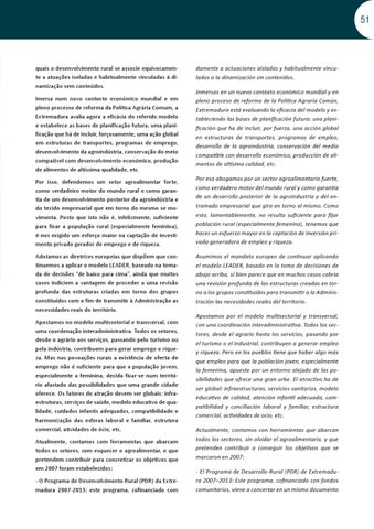 quais o desenvolvimento rural se associe equivocamente a atuações isoladas e habitualmente vinculadas à dinamização sem conteúdos. Imersa num novo contexto económico mundial e em pleno processo de reforma da Política Agrária Comum, a Extremadura avalia agora a eficácia do referido modelo e estabelece as bases de planificação futura, uma planificação que há de incluir, forçosamente, uma ação global em estruturas de transportes, programas de emprego, desenvolvimento da agroindústria, conservação do meio compatível com desenvolvimento económico, produção de alimentos de altíssima qualidade, etc. Por isso, defendemos um setor agroalimentar forte, como verdadeiro motor do mundo rural e como garantia de um desenvolvimento posterior da agroindústria e do tecido empresarial que em torno do mesmo se movimenta. Posto que isto não é, infelizmente, suficiente para fixar a população rural (especialmente feminina), é-nos exigido um esforço maior na captação de investimento privado gerador de emprego e de riqueza. Adotamos as diretrizes europeias que dispõem que continuemos a aplicar o modelo LEADER, baseado na tomada de decisões “de baixo para cima”, ainda que muitos casos indiciem a vantagem de proceder a uma revisão profunda das estruturas criadas em torno dos grupos constituídos com o fim de transmitir à Administração as necessidades reais do território. Apostamos no modelo multissetorial e transversal, com uma coordenação interadministrativa. Todos os setores, desde o agrário aos serviços, passando pelo turismo ou pela indústria, contribuem para gerar emprego e riqueza. Mas nas povoações rurais a existência de oferta de emprego não é suficiente para que a população jovem, especialmente a feminina, decida fixar-se num território afastado das possibilidades que uma grande cidade oferece. Os fatores de atração devem ser globais: infraestruturas, serviços de saúde, modelo educativo de qualidade, cuidados infantis adequados, compatibilidade e harmonização das esferas laboral e familiar, estrutura comercial, atividades de ócio, etc. Atualmente, contamos com ferramentas que abarcam todos os setores, sem esquecer o agroalimentar, e que pretendem contribuir para concretizar os objetivos que em 2007 foram estabelecidos: - O Programa de Desenvolvimento Rural (PDR) da Extremadura 2007-2013: este programa, cofinanciado com