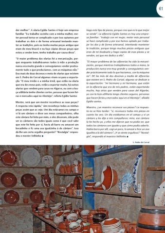 der melhor”. A olaria Egídio Santos é hoje um empresa familiar “Eu trabalho sozinho com a minha mulher, meter pessoal torna-se complicado e por isso optamos por trabalhar os dois e de forma artesanal tentando manter as tradições, pois eu tenho muitas peças antigas que eram do meu bisavô e eu faço cópias dessas peças que estou a vender bem, tenho trabalho por causa disso”. “O maior problema das olarias foi a mecanização, porque enquanto trabalhávamos todos à mão a produção nunca era muito grande e conseguíamos vender praticamente tudo o que produzíamos, com as máquinas não.” Das mais de duas dezenas e meia de olarias que existem em S. Pedro do Corval algumas viram-se para a exportação “O meu irmão e a minha irmã, que estão na olaria que era dos meus pais, estão a exportar muito, há outras olarias que vendem para casas no Algarve, eu com a louça utilitária tenho clientes certos, pessoas que fazem feiras e mercados aqui no Alentejo”, referiu Egídio Santos Mestre, será que um mestre reconhece as suas peças? A resposta veio rápida,” sim reconheço todas as minhas peças assim que as vejo. Um dia estávamos no campo e vi lá um cântaro e disse aos meus companheiros, olha este cântaro foi feito por mim, e eles disseram, não pode ser os cântaros são todos iguais como é que você sabe que este foi feito por si, havia ali barro eu amassei um bocadinho e fiz uma asa igualzinha à do cântaro”. Isso dá-lhe um certo orgulho perguntei? “Nostalgia” respondeu o mestre Velhinho ■