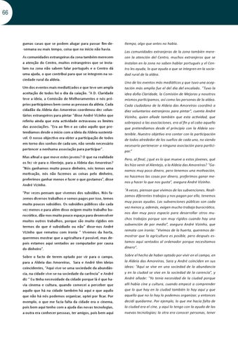 Sobre el hecho de haber optado por vivir en el campo, en la Aldeia das Amoreiras, Sara y André coinciden en sus ideas: “Aquí se vive en una sociedad de la abundancia y en la ciudad se vive en la sociedad de la carencia”, y André añade: “Yo tenía necesidad de la ciudad porque allí había cine y cultura, cuando empecé a comprender que lo que hay en la ciudad también lo hay aquí y que aquello que no lo hay lo podemos organizar, y entonces decidí quedarme. Por ejemplo, lo que me hacía falta de la ciudad era el cine, y aquí lo tengo con la ayuda de las nuevas tecnologías; la otra era conocer personas, tener