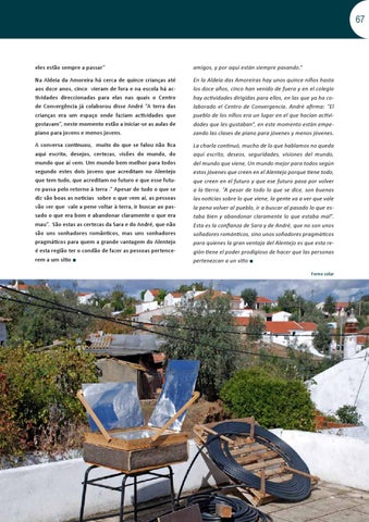 En la Aldeia das Amoreiras hay unos quince niños hasta los doce años, cinco han venido de fuera y en el colegio hay actividades dirigidas para ellos, en las que ya ha colaborado el Centro de Convergencia. André afirma: “El pueblo de los niños era un lugar en el que hacían actividades que les gustaban”, en este momento están empezando las clases de piano para jóvenes y menos jóvenes.