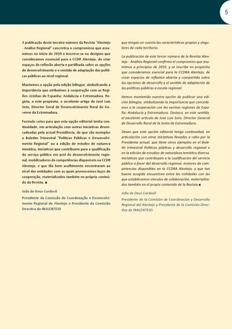 que tengan en cuenta las características propias y singulares de cada territorio. La publicación de este tercer número de la Revista Alentejo - Análisis Regional confirma el compromiso que asumimos a principios de 2010, y se inscribe en propósito que consideramos esencial para la CCDRA Alentejo, de crear espacios de reflexión abierta y compartida sobre las opciones de desarrollo y el sentido de adaptación de las políticas públicas a escala regional. Hemos mantenido nuestra opción de publicar una edición bilingüe, simbolizando la importancia que concedemos a la cooperación con las vecinas regiones de España: Andalucía y Extremadura. Destaco, en este sentido, el excelente artículo de José Luis Soto, Director General de Desarrollo Rural de la Junta de Extremadura. Deseo que esta opción editorial tenga continuidad, en articulación con otras iniciativas llevadas a cabo por la Presidenta actual, que tiene otros ejemplos en el Boletín trimestral Políticas públicas y desarrollo regional o en la edición de estudios de naturaleza temática diversa, iniciativas que contribuyen a la cualificación del servicio público a favor del desarrollo regional, motores de competencias disponibles en la CCDRA Alentejo, y que tan buena acogida encuentran entre las entidades con las que establecemos vínculos de colaboración, materializados también en el propio contenido de la Revista ■