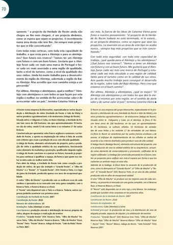 samento “ o projecto da Herdade do Rocim ainda não chegou ao fim nem chegará...é um projecto dinâmico, como se espera que sejam os projectos. O investimento numa área destas não tem fim...há sempre mais projectos que se irão concretizando”. Com todas estas certezas, com toda esta capacidade de trabalho, o que resta para o Alentejo e para os alentejanos? Que futuro nos reserva? “Vamos ter um Alentejo com futuro e com um bom futuro. Gostaria que o Alentejo fosse cada vez mais uma marca de Portugal e fosse cada vez mais associado a uma região de qualidade, tanto a nível do turismo, como a nível da qualidade dos seus vinhos. Ainda há muito trabalho para o desenvolvimento da região do Alentejo, sobretudo a região do Baixo Alentejo. Mas acredito que esse caminho esteja a ser percorrido”