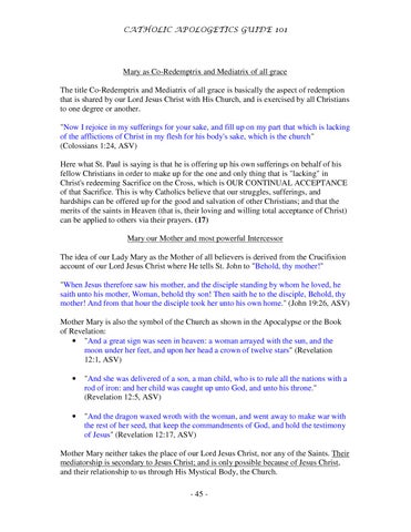 Mary as Co-Redemptrix and Mediatrix of all grace The title Co-Redemptrix and Mediatrix of all grace is basically the aspect of redemption that is shared by our Lord Jesus Christ with His Church, and is exercised by all Christians to one degree or another. "Now I rejoice in my sufferings for your sake, and fill up on my part that which is lacking of the afflictions of Christ in my flesh for his body's sake, which is the church" (Colossians 1:24, ASV) Here what St. Paul is saying is that he is offering up his own sufferings on behalf of his fellow Christians in order to make up for the one and only thing that is "lacking" in Christ's redeeming Sacrifice on the Cross, which is OUR CONTINUAL ACCEPTANCE of that Sacrifice. This is why Catholics believe that our struggles, sufferings, and hardships can be offered up for the good and salvation of other Christians; and that the merits of the saints in Heaven (that is, their loving and willing total acceptance of Christ) can be applied to others via their prayers. (17) Mary our Mother and most powerful Intercessor The idea of our Lady Mary as the Mother of all believers is derived from the Crucifixion account of our Lord Jesus Christ where He tells St. John to "Behold, thy mother!" "When Jesus therefore saw his mother, and the disciple standing by whom he loved, he saith unto his mother, Woman, behold thy son! Then saith he to the disciple, Behold, thy mother! And from that hour the disciple took her unto his own home." (John 19:26, ASV) Mother Mary is also the symbol of the Church as shown in the Apocalypse or the Book of Revelation: • "And a great sign was seen in heaven: a woman arrayed with the sun, and the moon under her feet, and upon her head a crown of twelve stars" (Revelation 12:1, ASV) •