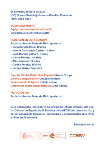 Esta publicación forma parte del programa infantil Chispas! del Centro Cultural de España en El Salvador de la AECID que busca dar voz y ser un espacio de formación, aprendizaje y comunicación para niños y niñas en El Salvador.