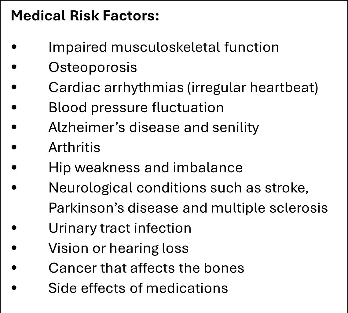American Academy of Orthopaedic Surgeons. (2024). Preventing falls among the elderly. Staying Healthy: Preventing Falls Among the Elderly. Home Safety is Bone Safety: Falls Awareness & Prevention Guide. https://www. orthoinfo.org/falls.