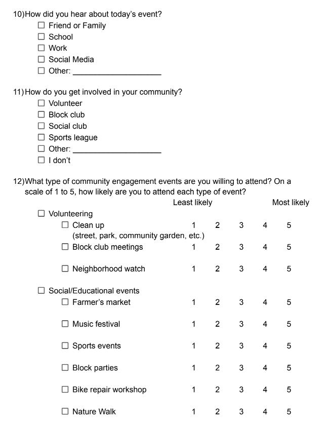 In the cumulative period consisting of classroom instruction, event planning and community involvement, the studio class piloted their solu tions involving equitable engagement at the clean-up event and recorded observations for future reference and analysis. In summary, this report is the culmination of exposure, committed efforts, and evaluations of the studio class’ understanding in equitable engagement practic es to recommend a viable plan for future planning frameworks.