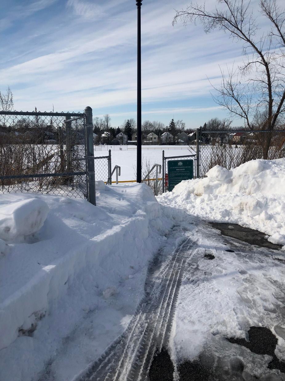 Currently overgrown with various plants, some of which are invasive plant species, the site is evidently not well tended to as there is much litter on the ground. Along the footpath, there is no lighting or seating, typical of a desire path, and there may be areas encroached on by tree branches and overgrowth. People generally use this space for exercising or walking their dog, but it appears to be less widely used compared to the paved rail trails within Minnesota Linear Park. On the other hand, Linear Park has more users, likely due to the presence of lighting, a few benches, and overall better maintenance and visibility of the area. Both the site and Minnesota Linear Park have issues with snow removal in the winter months, though less so for the latter. Workers plow the snow on the paved rail trail in Linear Park, though not necessarily in the areas surrounding it. This makes it difficult to access the park particularly for those with mobility issues. As for the site itself, snow is not cleared, and those who wish to utilize the space must essentially create their own path by trekking through the snow. The unmaintained path can also pose a safety concern during the spring season with wet ground and in the fall season with leaves and other organic debris.