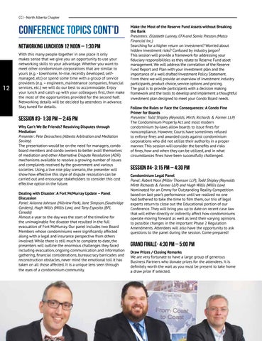 With this many people together in one place it only makes sense that we give you an opportunity to use your networking skills to your advantage. Whether you want to meet other condominium corporations that are similar to yours (e.g. - townhome, hi-rise, recently developed, selfmanaged, etc) or spend some time with a group of service providers (e.g. – engineers, maintenance companies, financial services, etc.) we will do our best to accommodate. Enjoy your lunch and catch up with your colleagues first, then make the most of the opportunities provided for the second half. Networking details will be decided by attendees in advance. Stay tuned for details.