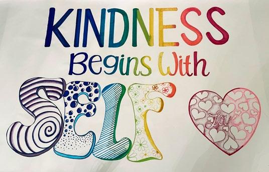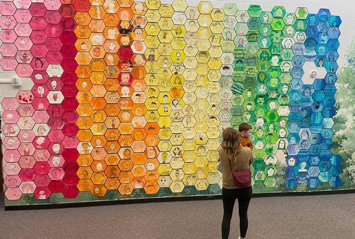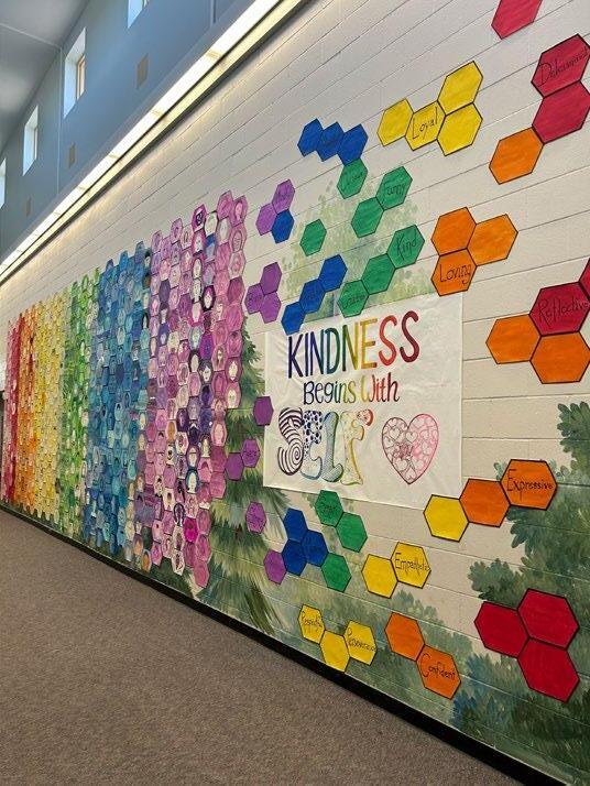 Our second schoolwide collaborative project is our yearly art installation. Running off Principal Dawson's SEL theme of "Kindness to Others" the program took it a step further to create an art piece that embraced the message: in order to be kind to others, we must first be kind to ourselves. One of our beloved teachers, Debbie Reynolds and one of our longtime art program volunteers Holly Maier, both suggested ideas that captured this messaging, and as it felt like kismet, we ran with it. Cheri Gajeski took the reins, and her vision became a stunning reality. Every student drew their very own self-portrait and added positive self-affirmations, sharing things they loved and loved about themselves. Each grade was assigned a specific color which created a rainbow wall full of self-expression and self-love. It is another conversation starter and display of individuality that breathes inspiration.