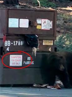doors to the dumpsters click shut and no trash is left outside the dumpsters, as it can attract bears. Some single-family homeowners who didn’t install bear boxes and the cleaners of those properties continue using the condo trash bins when they should be using the community dumpsters at the entrance to Northstar. If you are a single-family homeowner, please install a bear box and arrange for trash pickup, or use the community dump site. The dumpsters in the condo areas are there for the use of the condos only.