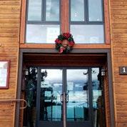 beams decorated with twinkling lights. Three sides of the building have floor-to-ceiling windows that overlook the Glenshire pond.