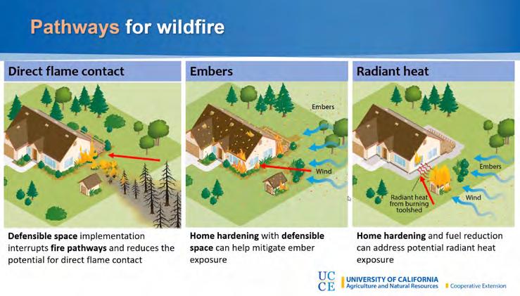 Here in Glenshire, there’s a lot more fuel in our parcels than the usual diagrams show, but it all contributes to fire spread. We need to be thinking about all the ways ignition happens. Image used with permission of Yana Valachovic, UC Cooperative Extension.