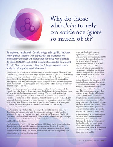 ccnm has developed a strong reputation for research both nationally and internationally. ccnm has published research findings in the British Medical Journal, International Journal of stds and aids, and Plos One, and has conducted joint research projects with partners including the Ottawa General Hospital, the Hospital for Sick Children, Health Canada and Canada Post Corporation. Earlier this year, the Canadian Medical Association Journal published the results of a randomized control trial on the reduction of cardiovascular risk through the provision of naturopathic care. The report demonstrates that nds may be an effective addition to health-care teams or individuals struggling with cardiovascular health, as participants in the naturopathic group experienced a reduced 10-year cardiovascular risk profile and a lower frequency of metabolic syndrome compared to the control group who received only enhanced usual care. ccnm encourages an open dialogue on the research and science associated with naturopathic medicine, and challenges the rhetoric put forward by Mr. Caulfield. So too would many of the patients who have sought naturopathic care, often in conjunction with biomedical treatment, and have found improved health.