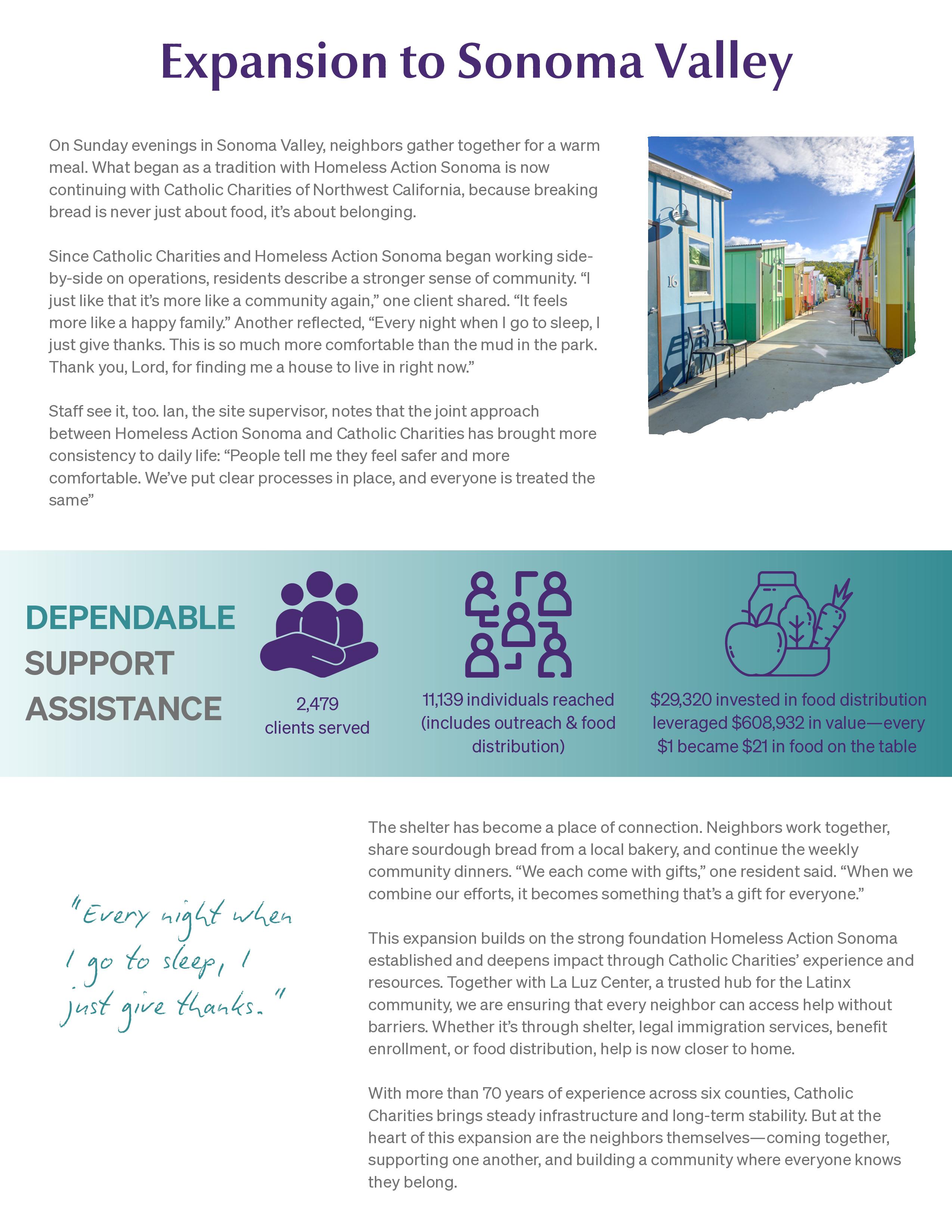 From serving over 7,200 neighbors to providing 500,000+ meals and helping 587 people find permanent housing, this year’s report is filled with stories of resilience, compassion, and community. Get a glimpse into how Catholic Charities of Northwest California is expanding its reach and deepening its impact across Northwest California.