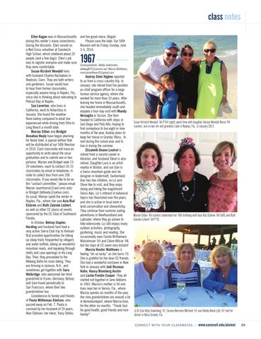 class notes Ellen Kagan was in Massachusetts during this winter’s many snowstorms. During the blizzards, Ellen served as a Red Cross volunteer at Sandwich High School, which sheltered about 29 people (and a few dogs). Ellen’s job was to register everyone and make sure they were comfortable. Susan Kirshnit Woodall lives with husband Charles Kochakian in Madison, Conn. They are both writers and gardeners. Susan would love to hear from former classmates, especially anyone living in Naples, Fla., since she is thinking about relocating to Pelican Bay in Naples. Sue Leverton, who lives in California, went to Antarctica in January. She found the weather there balmy compared to what she experienced while driving from Ohio to Long Beach a month later. Marian Silber and Bridget Donahue Healy have begun planning for Koiné Gold, a special edition that will be distributed at our 50th Reunion in 2016. Each classmate will have an opportunity to write about life since graduation and to submit one or two pictures. Marian and Bridget seek 1520 volunteers, each to contact 10-15 classmates by email or telephone, in order to collect bios from over 200 classmates. If you would like to be on the “contact committee,” please email Marian (auntmarsil@aol.com) and/ or Bridget (bdhealy@yahoo.com). As usual, Marian spent the winter in Naples, Fla., where she saw Asia Rial Elsbree and Ruth Zaleske Leibert, as well as other CC alums at events sponsored by the CC Club of Southwest Florida. In October, Betsey Staples Harding and husband Sam took a very active Sierra Club trip to Vietnam that provided opportunities for hiking up steep trails frequented by villagers and water buffalo, biking on wonderful mountain roads, and kayaking through inlets and cave openings in Ha Long Bay. Then, they proceeded to the Mekong Delta for more biking. They are thriving in Jackson, N.H., and sometimes get together with Sara Walbridge, who welcomed her third grandchild in Essen, Germany. Betsey and Sam travel periodically to San Francisco, where their two grandchildren live. Condolences to family and friends of Paula Mittleman-Edelson, who passed away on Feb. 7. Paula is survived by her husband of 29 years, Alan Edelson; her niece, Tracy Sibilia;