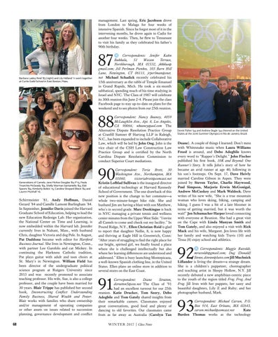 Deane). A couple of things I learned: Don’t mess with Whitesnake music when Laura Williams Freed is around, and Debo Adegbile knows every word to “Rapper’s Delight.” John Fischer published his first book, 10K and Beyond: One Runner’s Story. It tells John’s story of how he became an avid runner at age 40, following in his son’s footsteps. On Sept. 17, Dave Heivly married Caroline Gibson in Aspen. They were joined by Steven Taylor, Charlie Haywood, Paul Simpson, Marjorie Erwin McGonigal, Andrew McCuskey and Mark Waldeck. Dave writes of his new wife, “She is a true mountain woman who loves skiing, biking, camping and hiking. I guess I was a bit of a late bloomer in terms of getting married, but it was worth the wait!” Jen Schumacher Harper loved connecting with everyone at Reunion. She had a great visit on the Cape with Linda Munyan Smith and Tom Gately, and also enjoyed a visit with Rick Mack and his wife, Margaret. Jen loves life with her family and watching kids Travis (10) and Tessa (8) enjoy school and athletics.