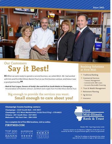 Champaign County banking centers: Champaign • 2229 South Neil • 359-9837 Champaign • 913 West Marketview (inside Rural King) • 378-8023 Urbana • 601 South Vine • 367-8451 Mahomet • 502 East Oak • 586-3450 For a complete list of First Mid locations, visit us online.