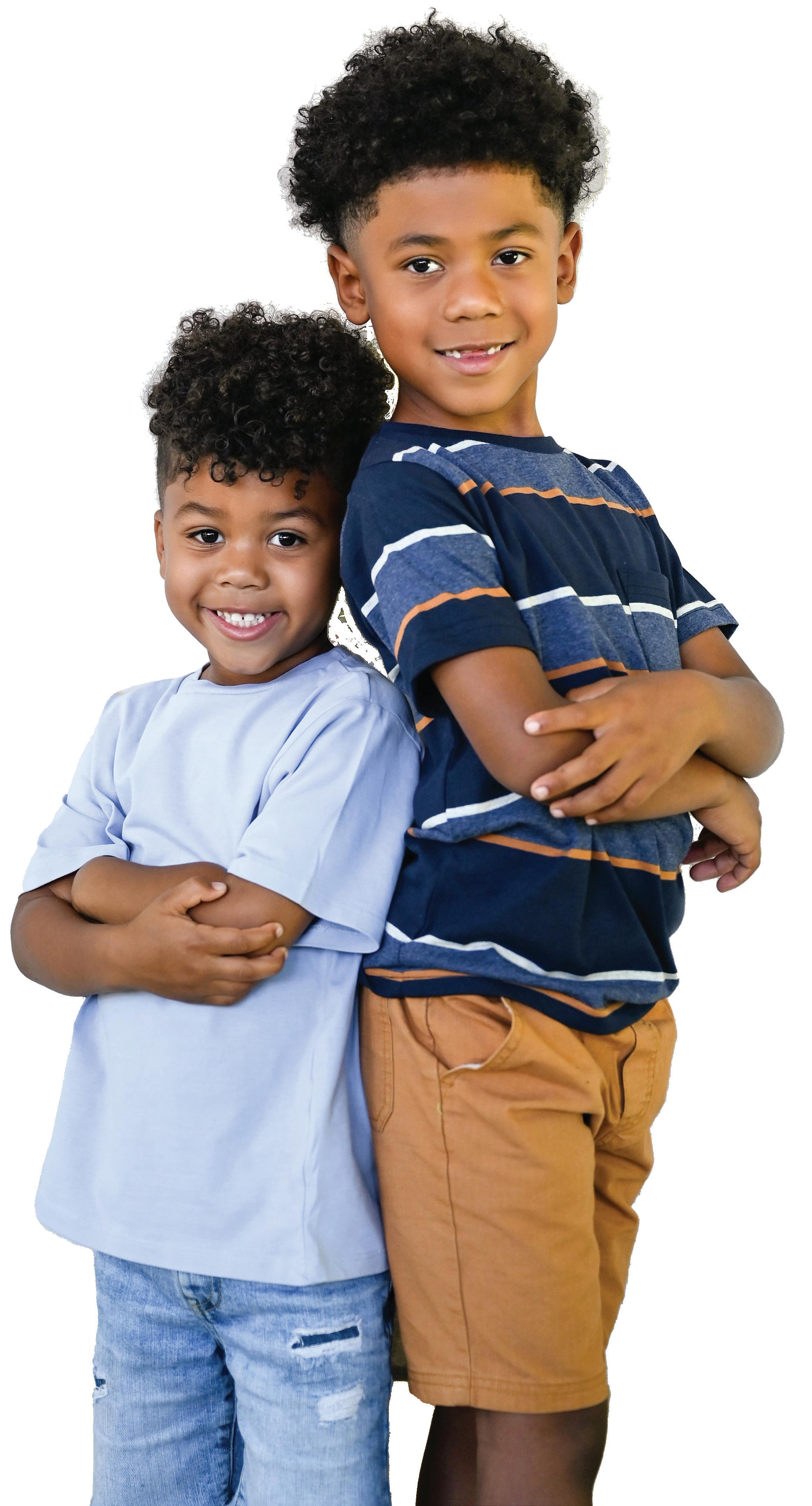 Meet our Cover Kids, Jrue & Josiah! Jrue is a creative and curious 6-yearold who loves to build and use his imagination. He enjoys playing with magnetic tiles, going to the public library, and learning all about dinosaurs—he knows the names of so many and what makes each one special. He loves all the Who Would Win books. Jrue hopes to be a paleontologist when he grows up. He’s also very thoughtful and kind—always looking out for his little brother and sister. Jrue loves hosting parties and making sure everyone has fun. Josiah is an adventurous and energetic 3-year-old with a big personality and a sweet heart. He loves Komodo dragons and takes his stuffed iguana everywhere he goes. Whether he’s outside riding his bike or racing his Hot Wheels, Josiah is always on the move. He’s athletic, fearless, and full of fun—always ready for the next adventure.