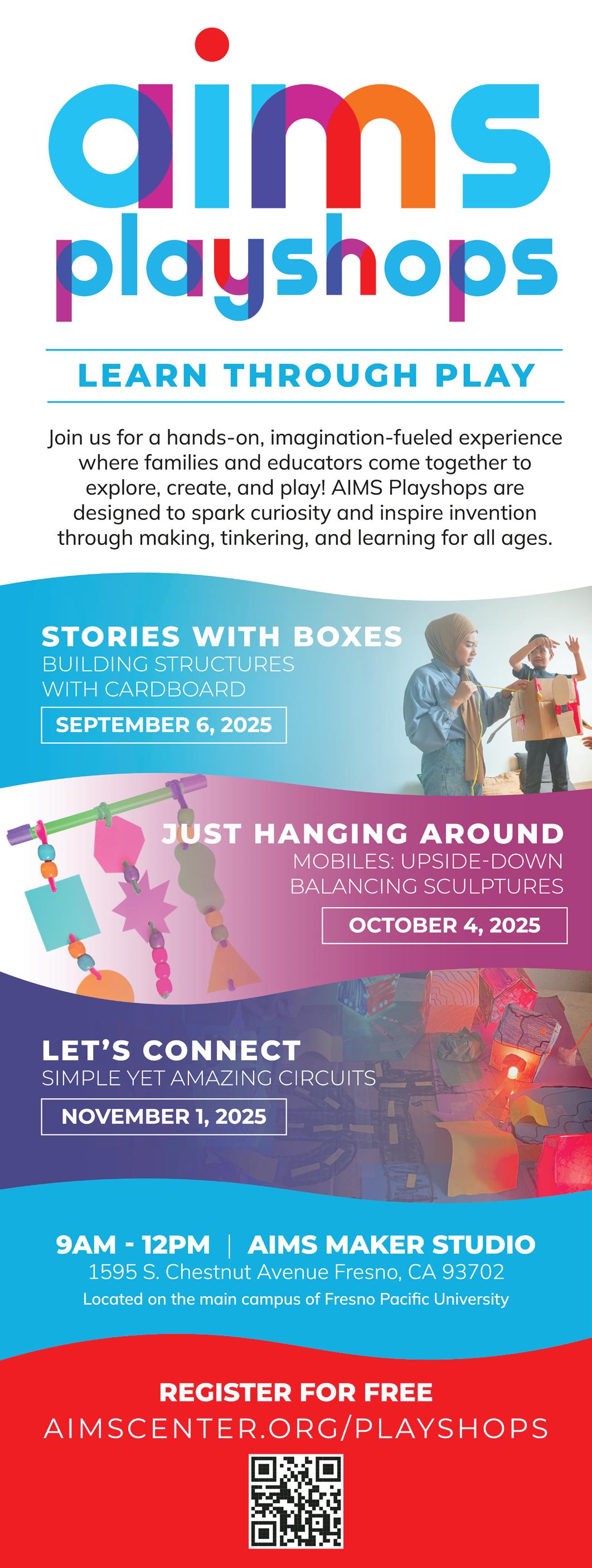 FIRST SATURDAYS Nurture scientific imaginations, build confidence, and encourage testing, tinkering, creating, and wonder today for only $1! 9 a.m.–2 p.m. Fresno Discovery Center, 1944 N. Winery Avenue, Fresno. (559) 251-5533