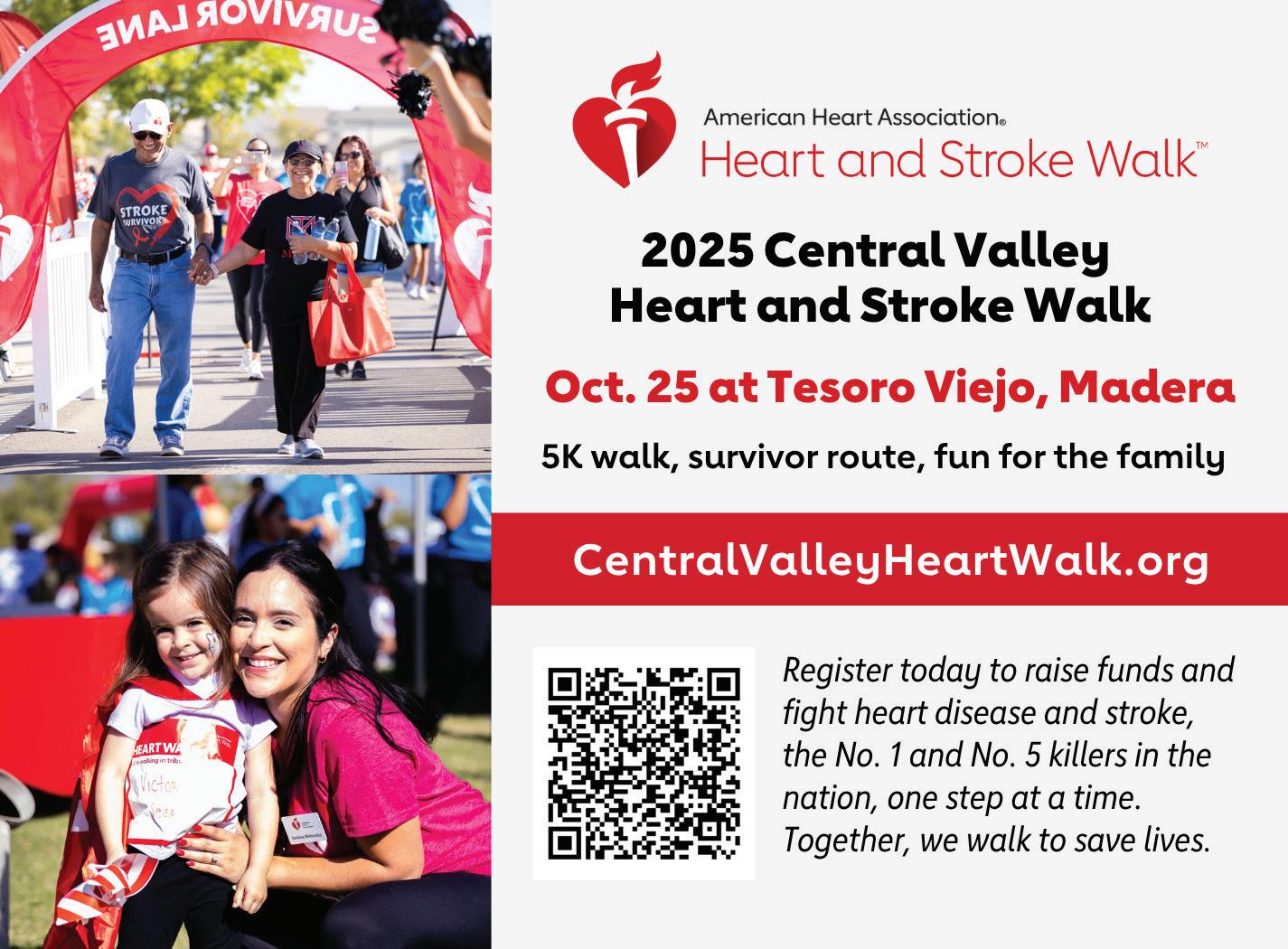 WALK & CELEBRATION This free, family event features a walk, snacks, music, activities, free shirts (while supplies last), and more! Register for free in advance. 8–11 a.m. Lions Town & County Park, 2300 Howard Road, Madera. (559) 200-8826