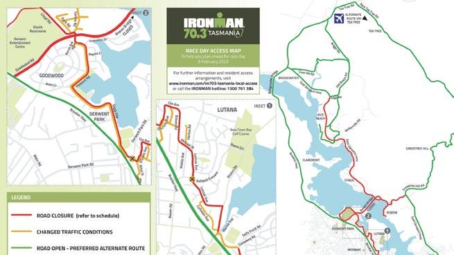 34 Eastern Shore Sun JANUARY 2023 Sport O’Grady Ave / Cook St Residential access available all day via Athol St and Brooker Inn carpark. Derwent Park Rd Vehicle Crossing Point available all day. Access only via Southbound on Brooker Highway Gepp Pde / Howard St Southbound lane CLOSED. Northbound open. Residents on eastern side of Road call hotline to arrange safe crossing Centre Rd / Park Rd Residential Exit available under Controlled Traffic Conditions. Access arrangements for this location are Exit Only. Risdon Rd, Lennox Ave, Michael St, Bowen Rd, Cox Ave and Furneaux Ave exit is ONLY available under pre-arranged Police Escort. Residents on these roads call hotline to arrange safe egress. InterCity Cycleway CLOSED. Please use suggested alternate route of Bay Rd, Park St, Letitia St, Campbell St Bell St access via Bellevue Parade. access via Risdon Road under controlled Traffic Conditions. Risdon Rd access only via Southbound on Brooker Highway. 12:30PM 2023 Road Closure 12:30PM 2023 Road Closure 12:30PM 2023 Road Closure 12:30PM 2023 1 Lane Closure HOBART EAST 12:00PM 2023 Road Closure 12:00PM 2023 Road Closure 12:00PM 2023 Road Closure CLOSURES 2023 7:00PM 2023 40% Closure 2023 7:00PM 2023 100% Closure 12:00PM 2023 Tow Away Area 2023 12:00PM 2023 Tow Away Area N O R T H E R N S U B U R B S Sunday, 5 February 2023 IRONMAN 70.3 Tasmania is a world class triathlon event coming to Hobart. This major event will see 1200 athletes from around the world complete a 1.9km swim, 90km ride & 21.1km run. P U B L I C E V E N T N O T I C E CHANGED TRAFFIC CONDITIONS IRONMAN 70.3 Tasmania will involve Changed Traffic Conditions in your area. Please read this IMPORTANT information outlining these changed traffic conditions during the event to help you plan ahead for travel arrangements. We’d like to thank you for your cooperation. The event would not be possible without the support of the local community. For further information, please visit www.ironman.com/im703-tasmania-local-access phone 1300 761 384 or email tasctc@ironman.com R N S U B U R B S 5 February 2023 Tasmania is a world class triathlon Hobart. This major event will see around the world complete a 90km ride & 21.1km