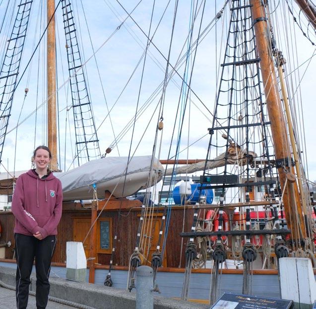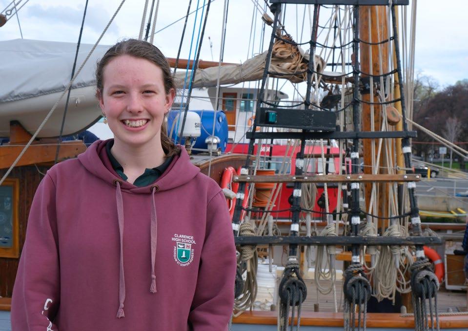 Clarence High School student Cameron Browning standing in front of the Windeward Bound. Photo credit: Tobias Hinds