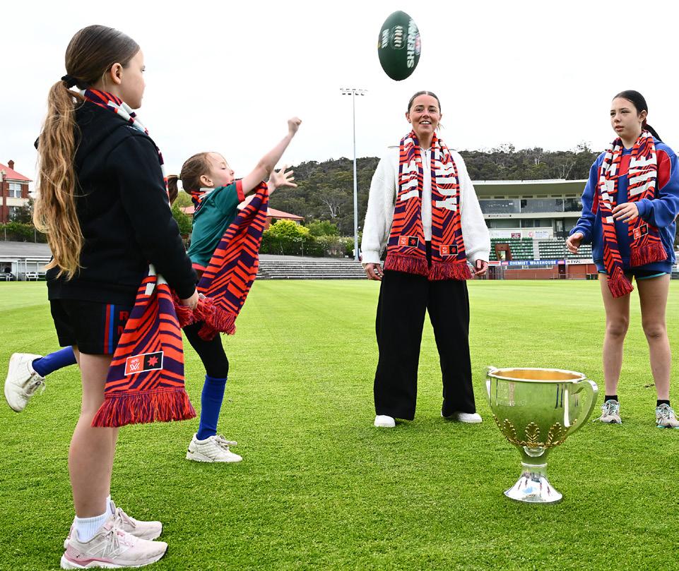 2021 Brisbane Lions premiership player and Tasmanian Jessica Wuetschner welcomed the cup to the state and spent time with junior players at a North Melbourne AFLW clinic at Cornelian Bay. Born in Tasmania and now a player for Essendon, Jessica passed the cup on while travelling to various clubs and academies on the way to Launceston. Jessica said it was special to bring the cup home to Tasmania, reflecting on how far the AFLW had come in a decade.