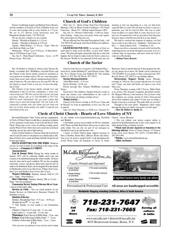 Circle of Christ Church - Hearts of Love Ministry of NY Reverend Elisamuel “Sam” Colon and the congregation of Circle of Christ Church would like to extend an invitation of love and peace in the name of our Lord and Savior, Jesus Christ. Please join us for a time of adoring worship, praise and the Word of God. Allow the Lord to reach into your heart and help you see the road of light and joy. Circle of Christ Church is a beacon which the Lord has lit onto Co-op City and it is our purpose as a church and as children of God to serve, teach and bring forth the Gospel for all to hear and witness. FOCUS SC R IPT UR E FOR T HE W EE K: Whatever you do, in word or deed, do everything in the name of the Lord Jesus. —C olossia ns 3:17 (NR SV) Announcements: Coa t & Swea ter Dr ive: During the whole month of January, CCC will be collecting slightly used coats and sweaters to be distributed during the winter months. All items must be clean and in good condition. We are also accepting warm hats, scarves, and gloves; these items must be new in order to be distributed. Items can be dropped off at the church on Wednesdays from 6 p.m. thru 8 p.m., Fridays from 5 p.m. thru 7 p.m. and Sundays from 10 a.m. thru 12 p.m. Women’s Fellowship: Saturday, January 22nd at 1:30 p.m. – Topic: “Your Finances.” Men’s Fellowship: Saturday, January 29th at 12 p.m. – Topic: “Are You Listening?” Communion Ser vice: Sunda y, Febr ua r y 6th a t 11a .m . – Join us at the Lord’s table. Ser vices on Ca ble – You can watch portions of our Sunday Services on Cablevision’s Bronxnet, Channel 70, Saturdays at 4 p.m. Schedule of Ser vice: Sundays: Discipleship Class - 9:15 a.m. – 10:30 a.m. Worship Service*** - 11 a.m. start ** First Sunday of each month is our Communion Service. Children’s Church (4-12 years old) - 11 a.m. start Little Lambs (2 – 4 years old) - 11 a.m. start Wednesda ys: Prayer Service & Bible Study - 7 p.m.. start Fr ida ys: Youth Fellowship & Bible Study - 7 – 9 p.m. Children’s Fellowship & Bible Study - 7 p.m. – 9 p.m. F Y I: • You can now see portions of our services and worship