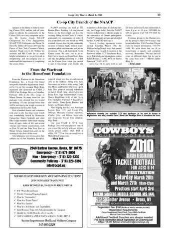 some of whom have had several tours of duty in the Mideast. Along with these brave men and women, were several Gold Star Moms and Families who were a great help. This group of amazing individuals included Gold Star Mom/Advocates Emily Toro; Hope Hollinsworth-Coaxum; Sharon Engeldrum (wife of late Co-op City Firefighter Christian P. Engeldrum) and family; Nancy-Lenis Fuentes and family, and Simona Francis. Also helping this day was American Legion Post 1871 and Co-op City Veterans Memorial Council members, Charlie Lirio and Wilson Sepulveda, and long-time Co-op City resident, Olga Bruh. Our next CARE 2 GIVE Care Package Drive will take place in June. If you would like to help with our organization, please contact Mark Bruh at (646) 359-7723 or you can email him at Mark.Bruh@gmail.com. —M a r k Br u h
