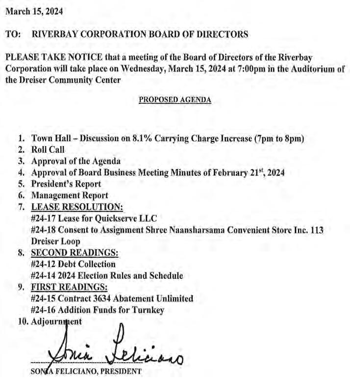 Riverbay Board President Sonia Feliciano has called a town hall meeting to be held in Dreiser Auditorium on Wednesday, March 20, to discuss the April 1, 2024 carrying charge increase with shareholders.