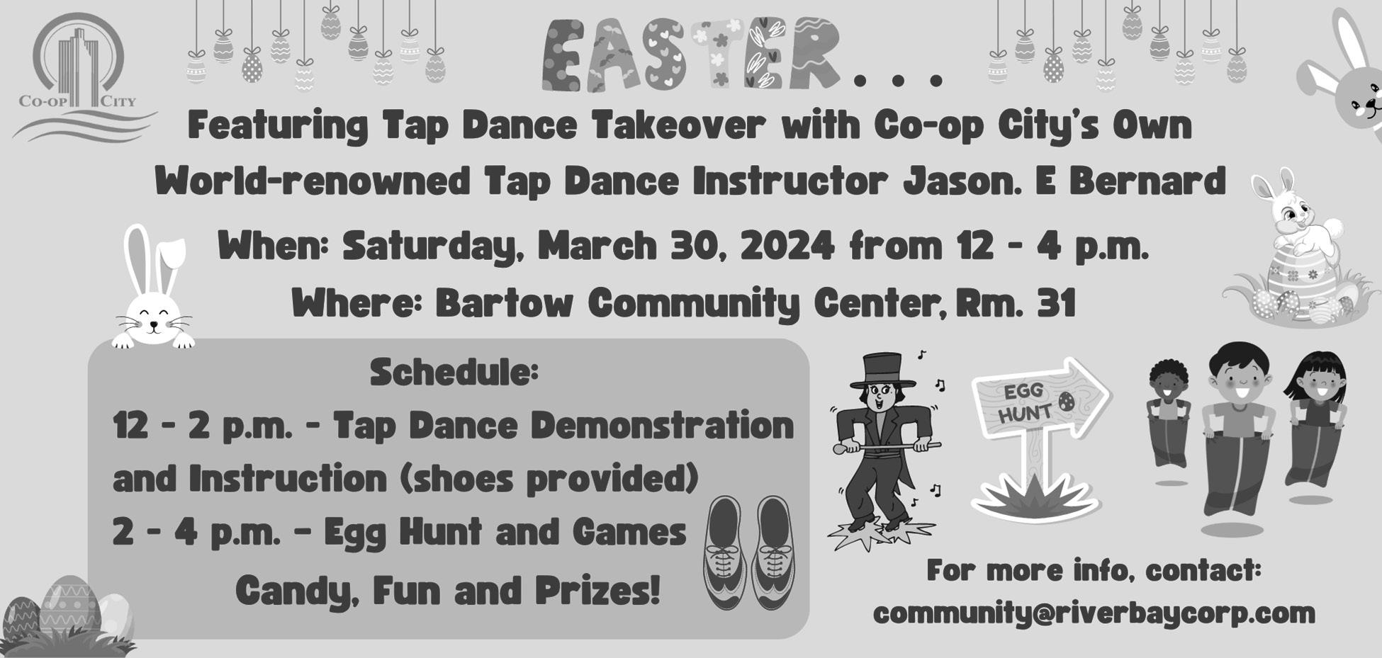 Bring your children and join Co-op’s own Jason E. Bernard, world-renowned tap dance instructor, next Saturday, March 30, between 12 and 2 p.m. for a Tap Dance Takeover! Tap dancing shoes are included for the tap dancing instruction and demonstration. Following Tap Dance Takeover, there will be an Easter egg hunt and games from 2 to 4 p.m. This free event will be held in Room 31 of Bartow Community Center.