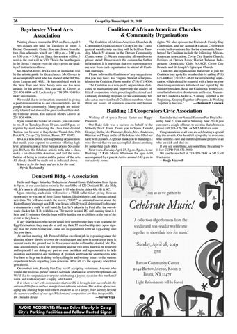 rights. We also sponsor the Friends & Family Day Celebration, and the Annual Kwanzaa Celebration events, both events are free for the community. Members of the Coalition include the following: AfricanAmerican Association; Co-op City Baptist Church; Retirees of Dreiser Loop; Harriet Tubman Independent Democratic Club; NAACP, Co-op City Branch; and St. Joseph’s Episcopal Church. Churches and organizations that desire to join the Coalition may apply for membership by calling (718) 671-4506 or (718) 671-9610 for membership application, which should be returned with a letter on your church/organization’s letterhead and signed by the minister/president. Read the Coalition’s weekly column for information about events and issues. Remember the Coalition’s Motto is, “Coming Together is the Beginning, Keeping Together is Progress, & Working Together is Success.” —Harman T. Leacock