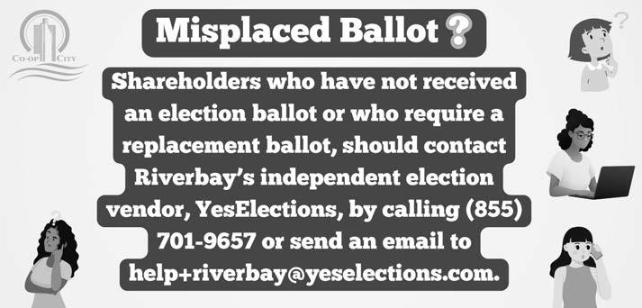 Ballots can be returned in one of two ways. They can be mailed in the postage paid, pre-addressed envelope provided with the ballot, in which case the envelope must be postmarked by June 28, 2024 to be counted in the election. Or, shareholders may choose to vote electronically using an iPad, computer or smartphone. To do so, type “riverbayvotes.com” into the address bar on your browser, enter the unique PIN and Code from your ballot, and follow the onscreen instructions. Electronic ballots must be received by YesElections by 9:00 p.m. on Friday, June 28, to count in the election.