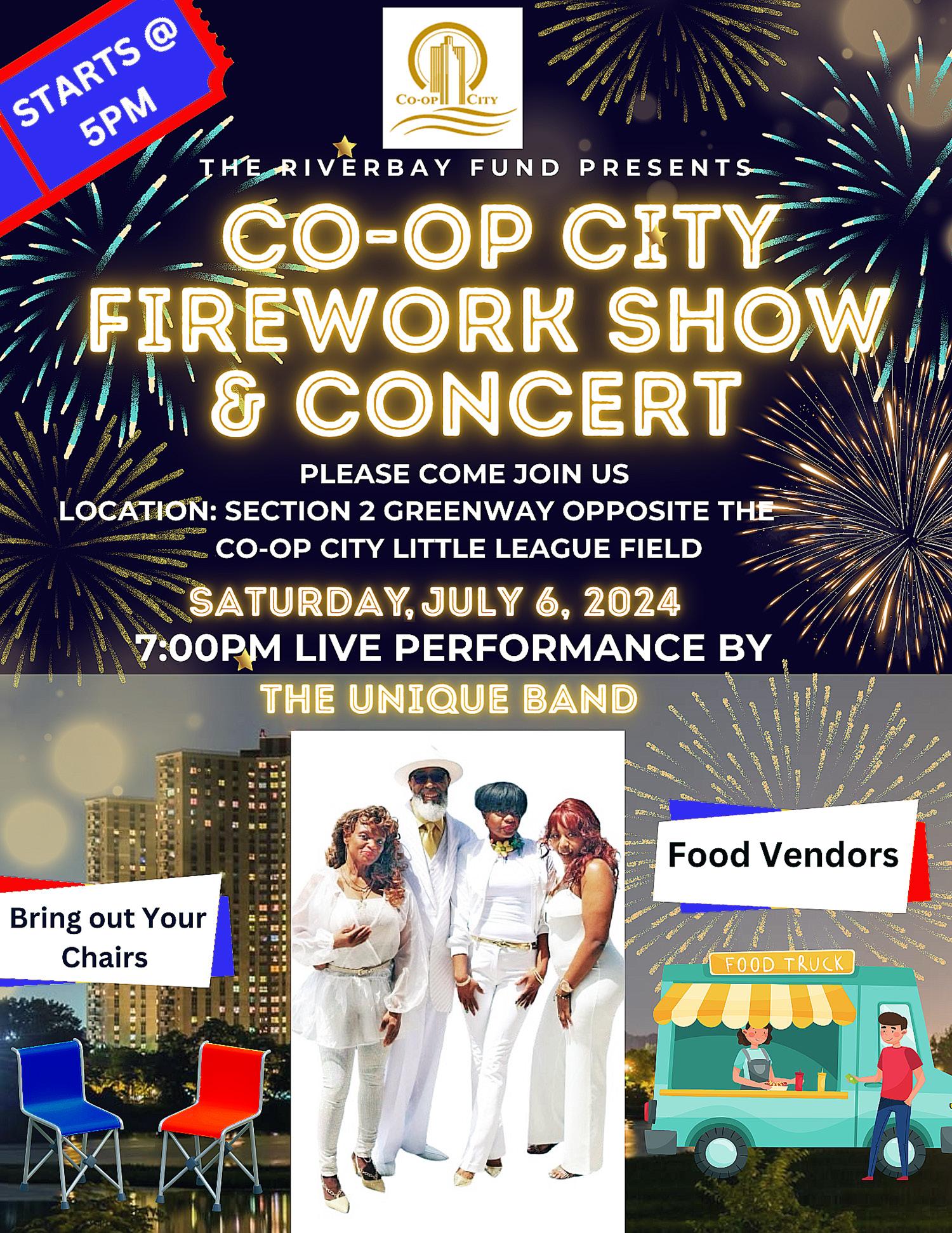 The annual Riverbay Fireworks and Concert will take place on Saturday, July 6, starting at 5 p.m. on the Section 2 Greenway. There will be food vendors and performance by the Unique Band at 7 p.m., followed by fireworks at dusk.