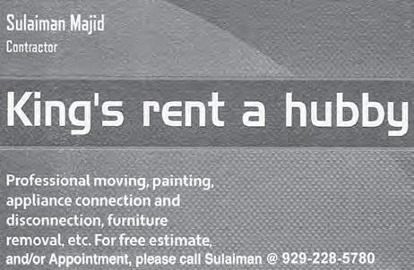 EMERGENCY SERVICE L & L APPLIANCE REPAIR ALL MAKES & MODELS 10/30 Executive Exotic Limo •Proms •Sports Events •Weddings •Funerals •Tours •Sweet 16 •Special Occasions •Airports•Casinos : 212-531-3792 Mobile: 917-560-6838 Toll Free: 855-369-9936 ExecutiveExoticLimo.com ExecutiveSecurityProtection.com Casino Specials Atlantic City, NJ Foxwoods, CT Empire, Yonkers Resorts, Queens 10/27 Top Quality Work - Painting, Plastering, Tiles, Walls Call or 9/30 9/30 JB RYAN COMPUTER REPAIR & UPGRADE Repair – Upgrade – Data Recovery – Virus Removal –Laptop Overheats – Cracked Screen – Broken Power Jack. Call James 646-281-4475, 718-324-4332. 2/24 Will Pay Top $$ for JAZZ, JAZZ, JAZZ, Rock & Roll, Soul Music, Latin, 12/30 9/23 Custom Craftsmen – 40 yrs. experience. Sofas & Chairs upholstered; Slipcovers - Fabric & Plastic; Kitchen Chairs - $8.99 & up. Caning; Venetian Blinds; Drapes - Custom 9/30 9/23 10/7 9/30 Co-op City Times / September 30, 2023 27 • Basic Cleaning • Deep Cleaning • Move In/Out Cleaning • Bonded • 6 Days 9/23 12/16 Professional Window Cleaning • FAST RELIABLE SERVICE Cell: 1-203-482-6337 9/30 CO-OP SALES - JASON LASH • HANDYMAN SERVICES • RANGE HOODS • VERTICAL & MINI BLINDS • LIGHT FIXTURES • SINK VANITIES • KITCHEN CABINETS • SPACE SAVERS • CABINET REFACING • MATCHING HAMPERS • COUNTERTOPS • BATHTUB ENCLOSURES • CUSTOM CLOSET MIRROR DOORS • CLIP-ON MIRROR FRAMES • CUSTOM WALL MIRRORS Vertical, Mini, Wood, Pleats 9/30 Co-op City Resident Specials Breathe Easy Eliminate Bugs 9/23 Please see page 7 for information on how to apply for employment opportunities within Riverbay Corporation. 718-320-3300 x3379 • cctimes@riverbaycorp.com Learn To Drive Here: Alpha & Omega Driving School Register at www.Anods.net Call/Text: 347-449-2905; 347-391-2217; Cell: 718-600-6563; Book: 929-666-5085 Scan the QR Code to Book Your Hair Experience Now and Get 10% O Your First Visit! 77 Quaker Ridge Rd., Phenix Salon, Ste. 329 New Rochelle, NY Hairbypaulacstudio 11/4