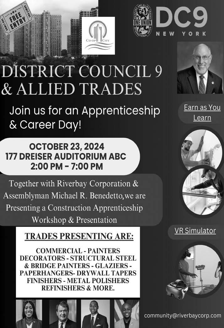 Come out to Dreiser Auditorium A, B & C on October 23, 2-7 p.m., for an apprenticeship and career day. Riverbay Corporation, in collaboration with Assemblyman Michael Benedetto, present a construction apprenticeship workshop and presentation highlighting careers in commercial painting and decorating, glazing, paper changing, and much more.
