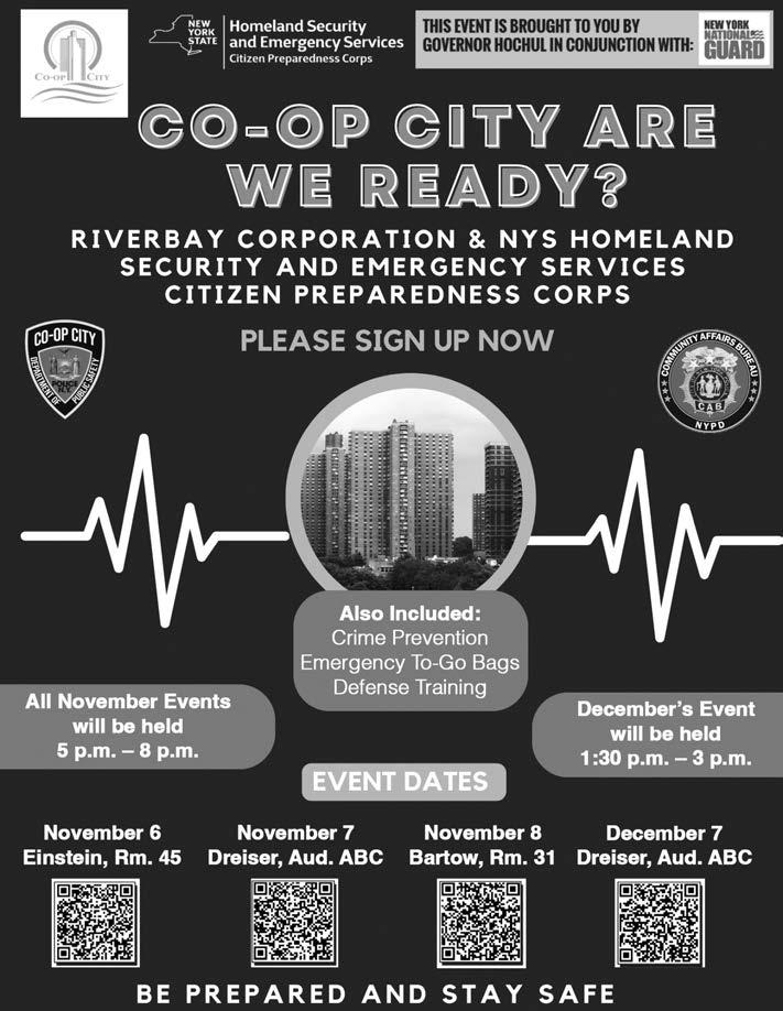 Preparedness is the key to safety. Governor Hochul, in conjunction with the New York National Guard, Riverbay Corporation, and NYS Homeland Security and Emergency Citizen Preparedness Corps, present a multi-day information session on emergency readiness, including crime prevention, defense training, and emergency to-go bags. Join us on one of the following dates to learn more: